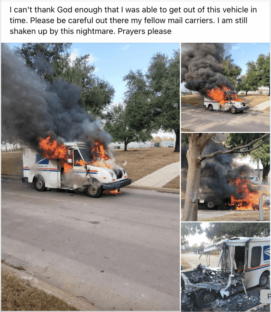 Mail truck fire – Location unknown